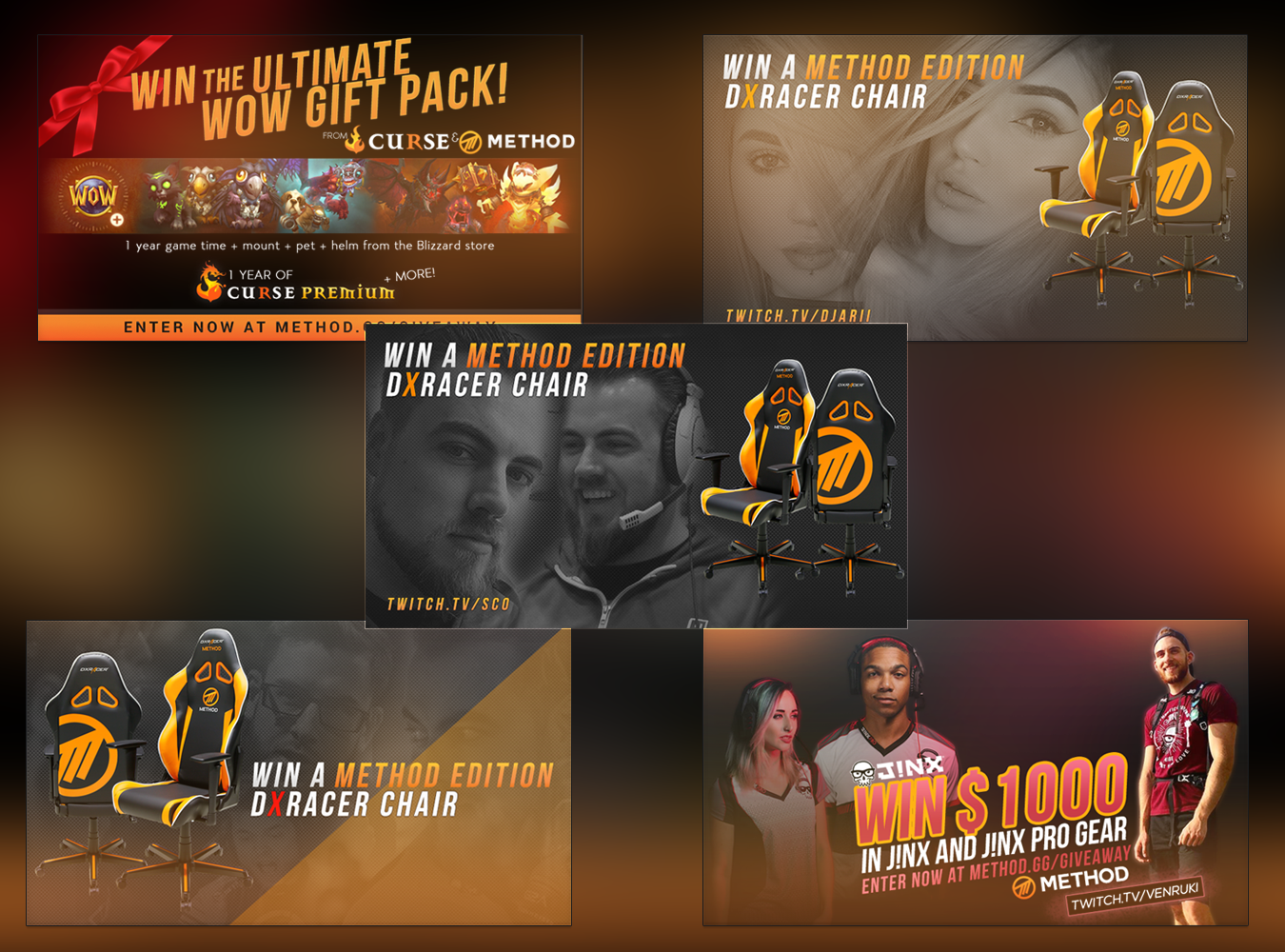 Brands featured are Method, Curse (now Twitch), DxRacer, and J!nx
